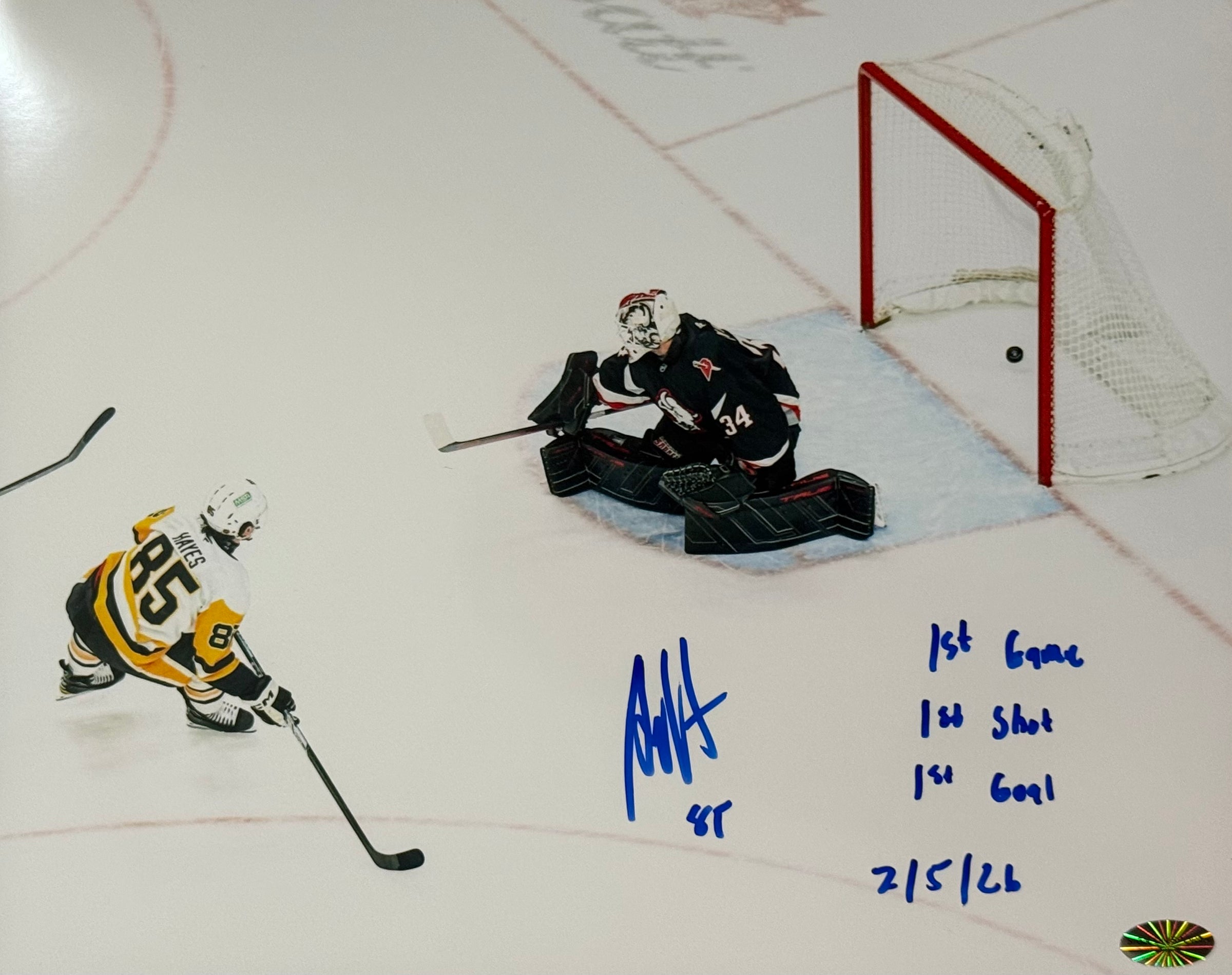 Avery Hayes Signed, Inscribed "1st Game, 1st Shot, 1st Goal" 8x10 Photo