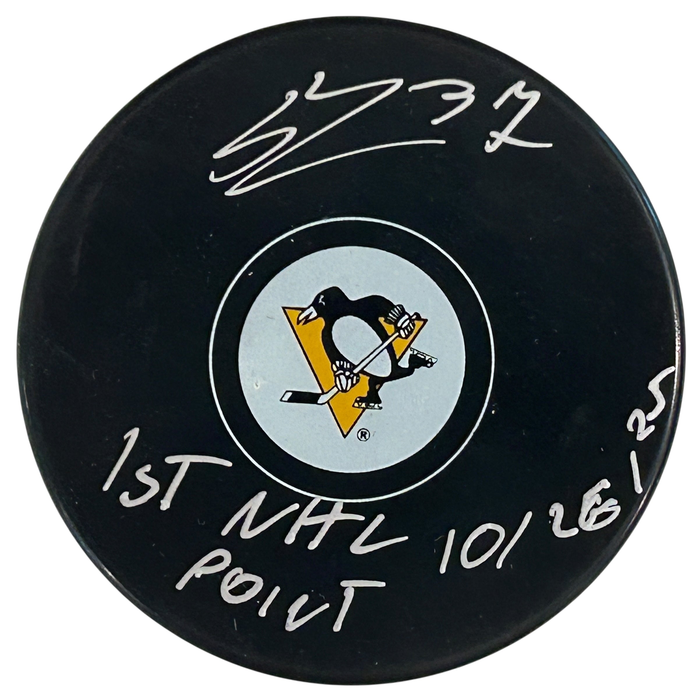 Arturs Silovs Autographed, Inscribed "1st NHL Point 10/26/25" Pittsburgh Penguins Hockey Puck which Arturs personally hand signed.