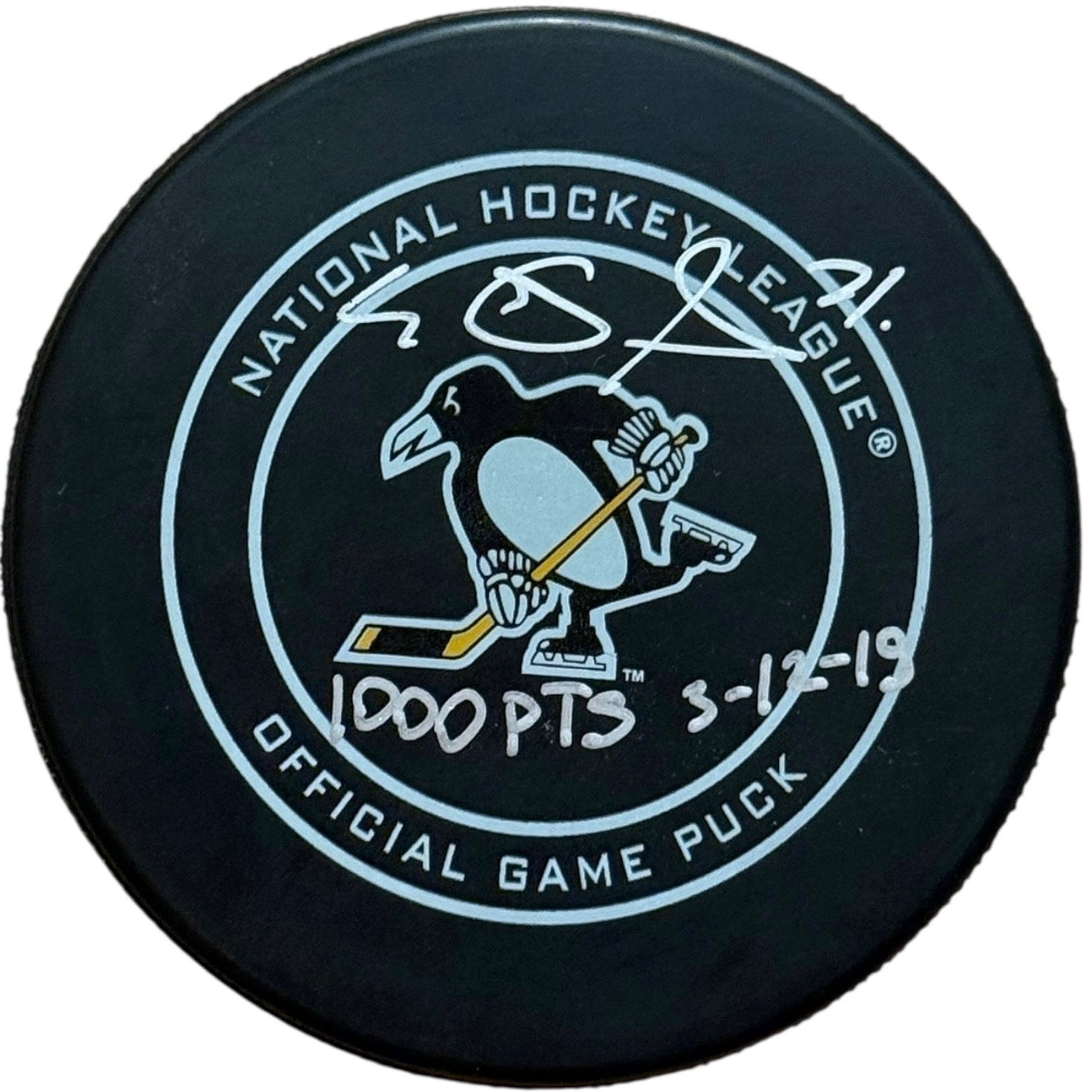 Evgeni Malkin Autographed, Inscribed "1000 PTS 3-12-19" Pittsburgh Penguins Game Model Hockey Puck, which Evgeni personally hand-signed.