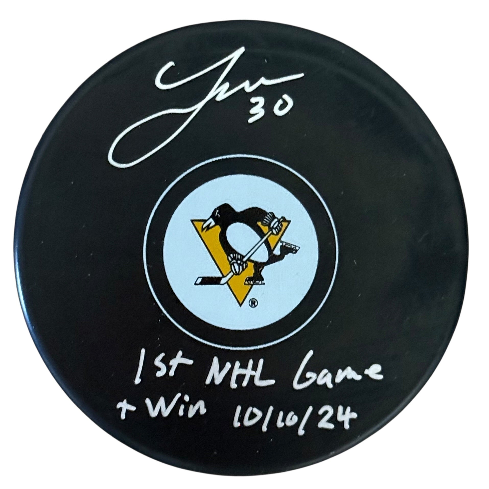 Joel Blomqvist Signed, Inscribed "1st NHL Game & Win 10/10/24" Pittsburgh Penguins Puck