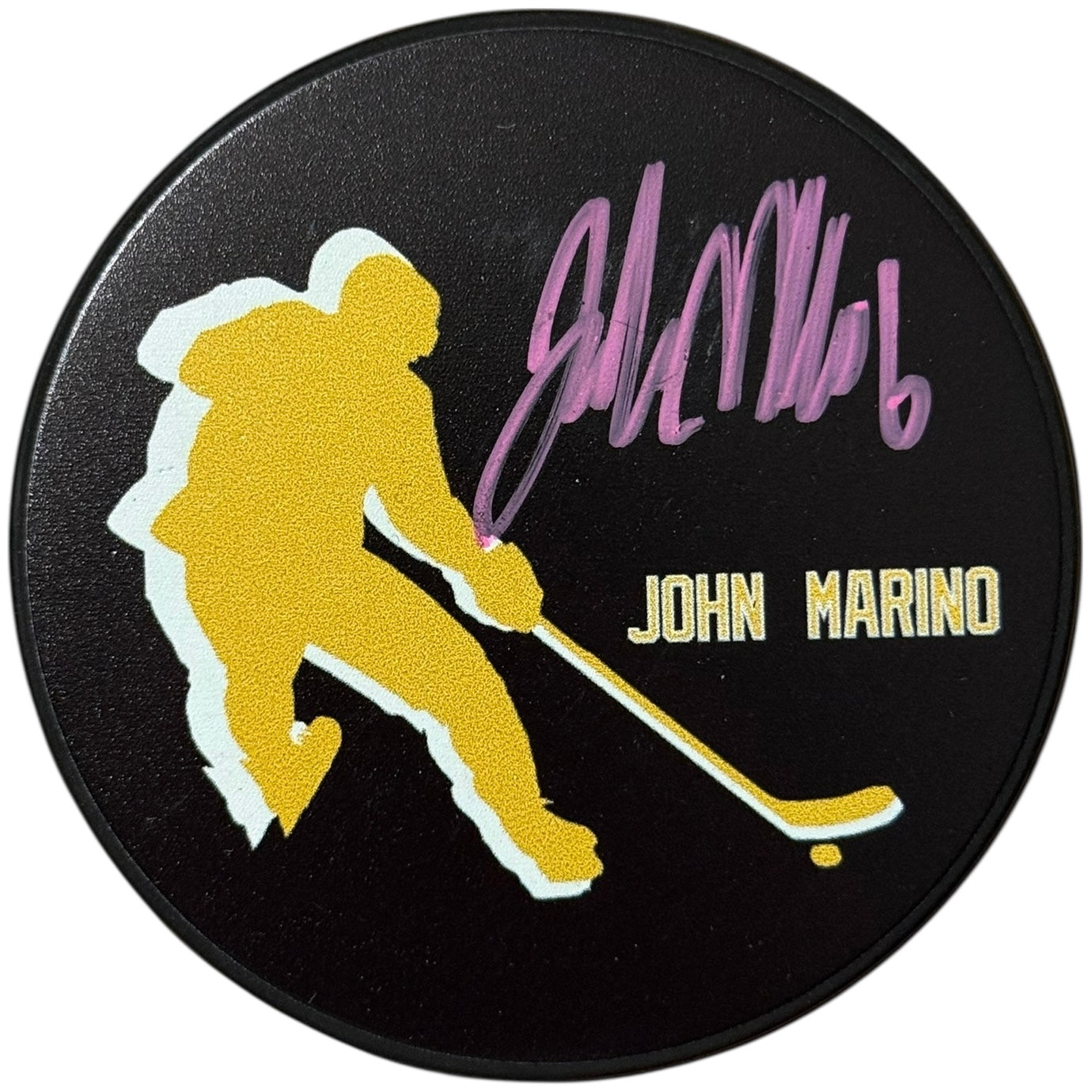 John Marino Autographed Commemorative First Goal Hockey Puck, which John personally hand-signed in Pink.