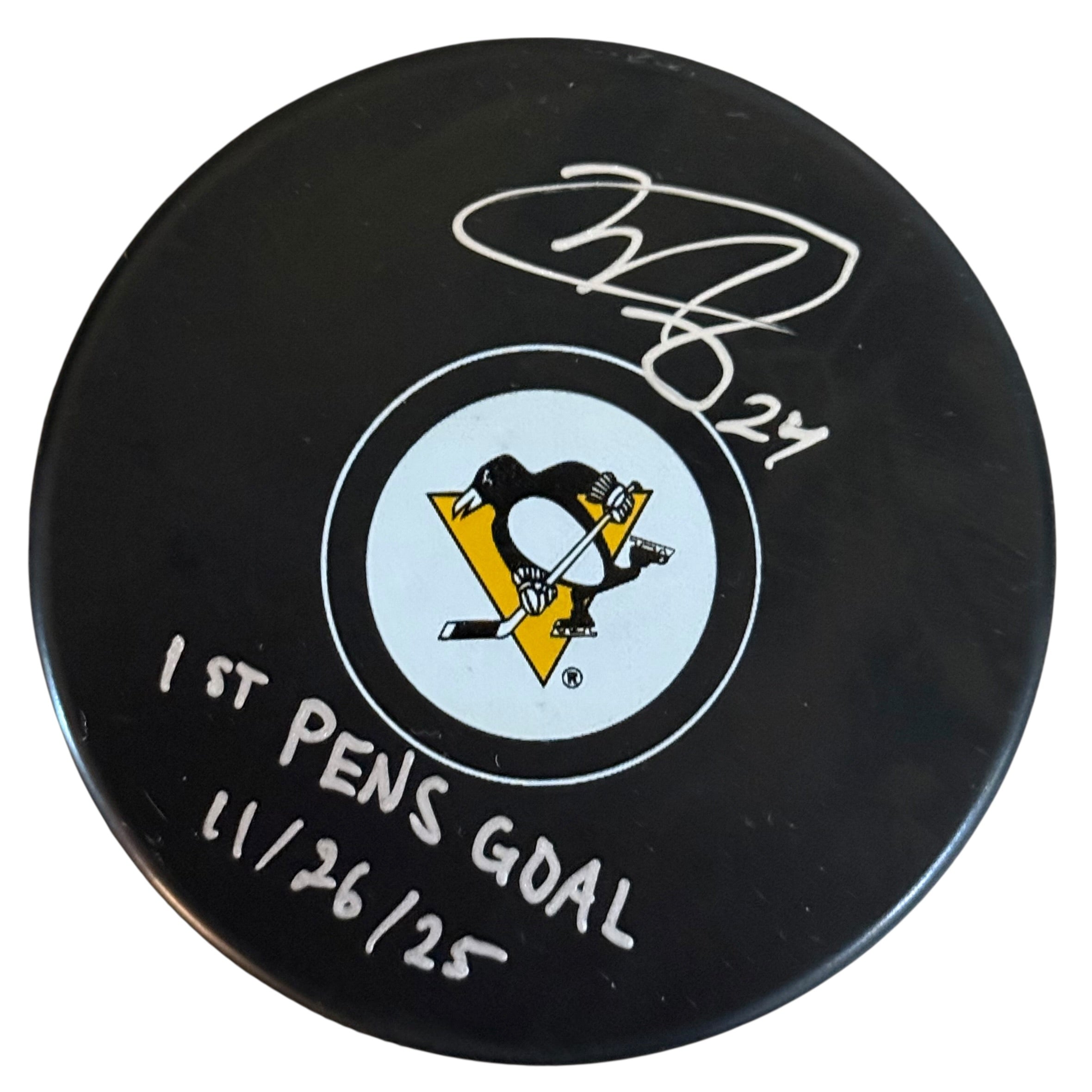 Matt Dumba Autographed, Inscribed "1st Pens Goal 11/26/25" Pittsburgh Penguins Hockey Puck, which Matt personally hand-signed.