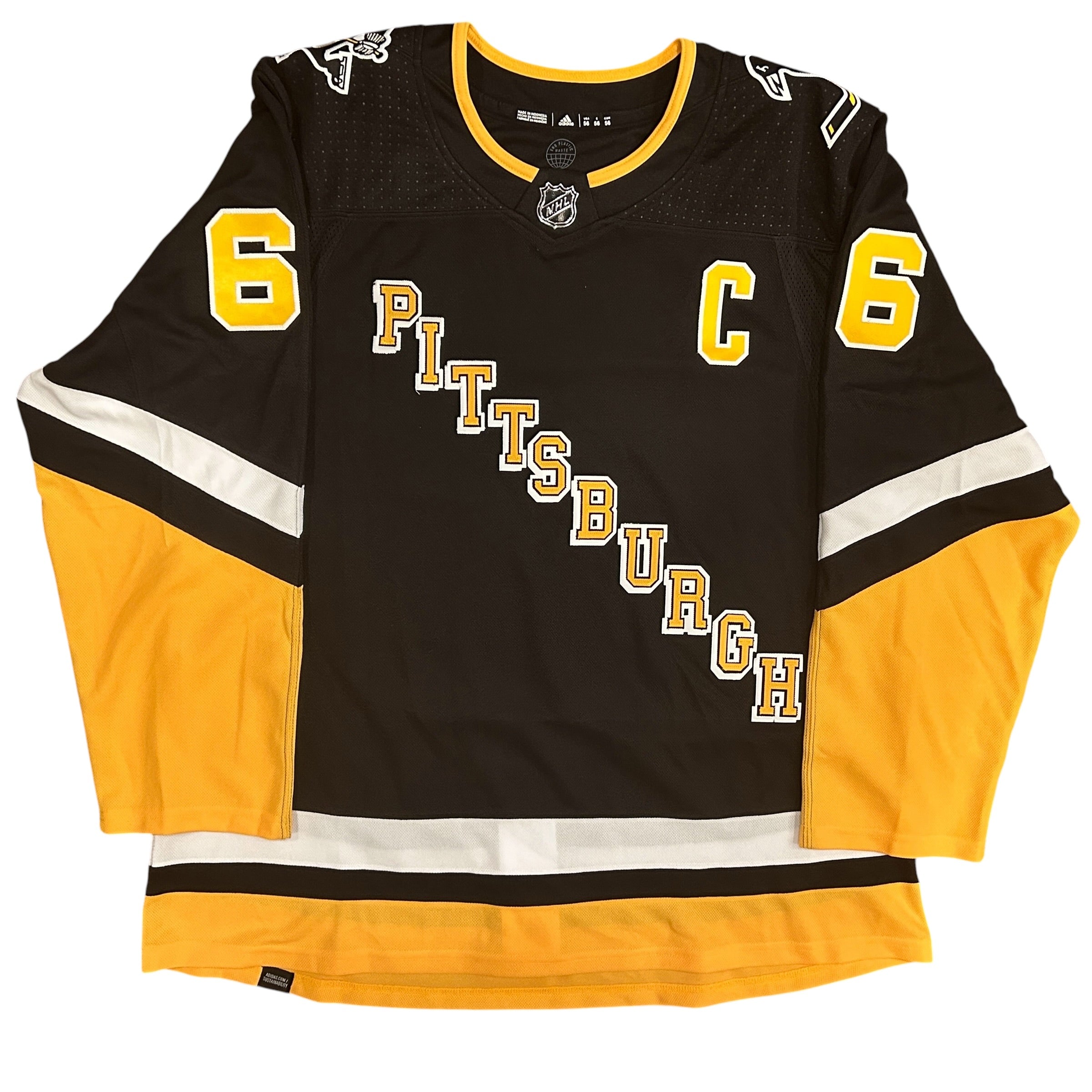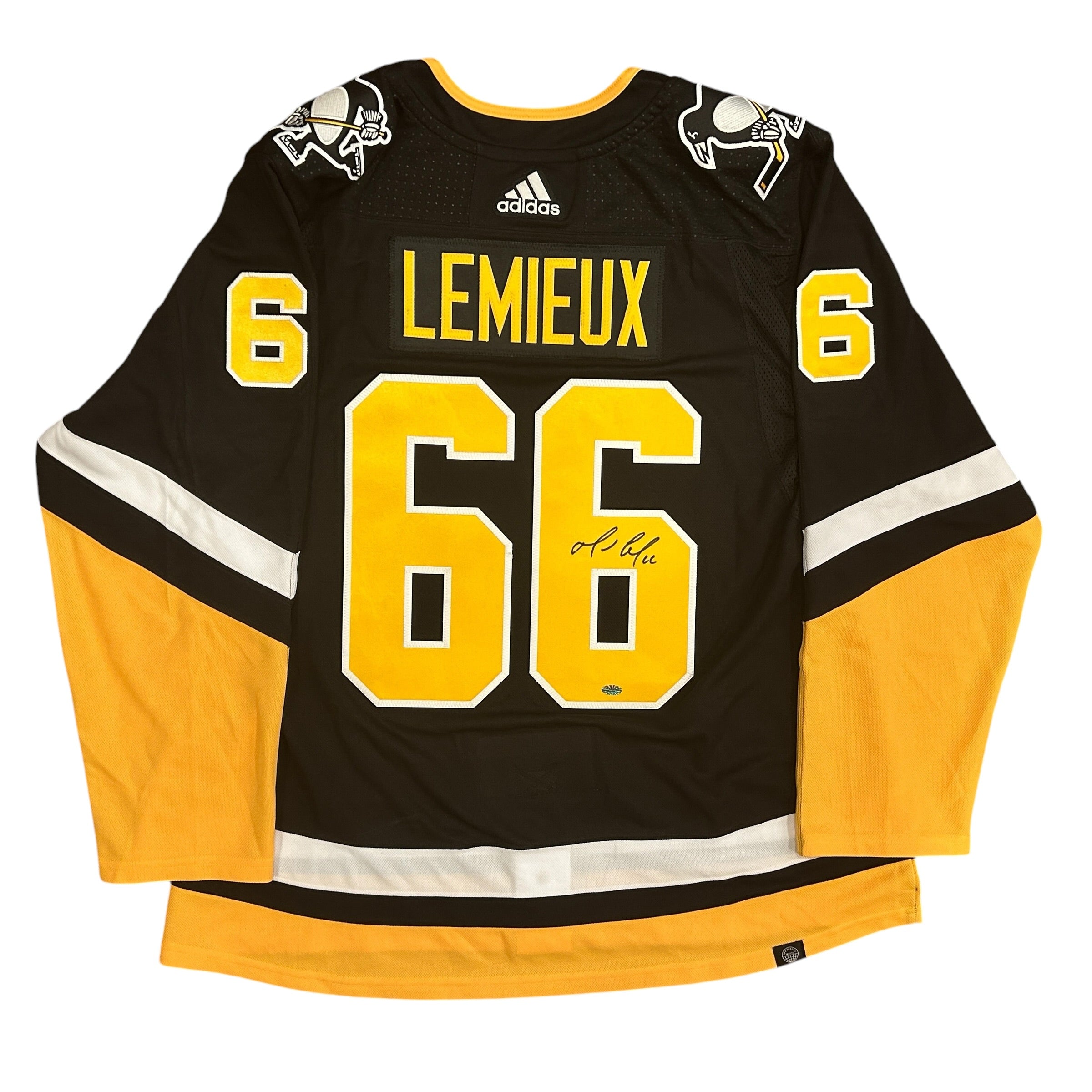 Mario Lemieux Autographed Pittsburgh Penguins Authentic Adidas Black Diagonal Pittsburgh Jersey with Fight Strap, which Mario personally hand-signed. New with tags. Size 56.