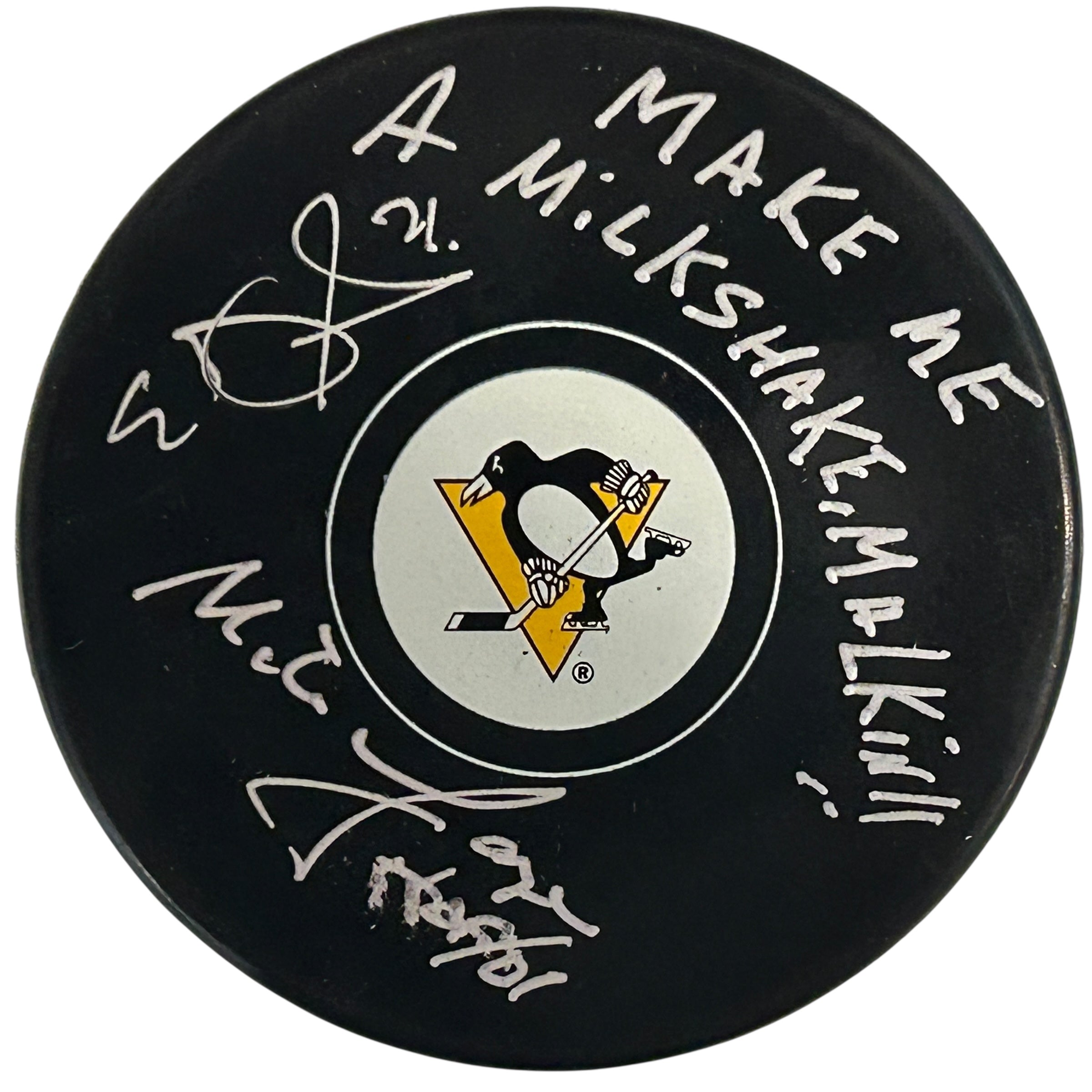 Mike Lange & Evgeni Malkin Autographed, Inscribed Pittsburgh Penguins Puck- Inscribed by Mike "Make Me A Milkshake Malkin!!". Both Evgeni and Mike personally hand-signed the photo.
