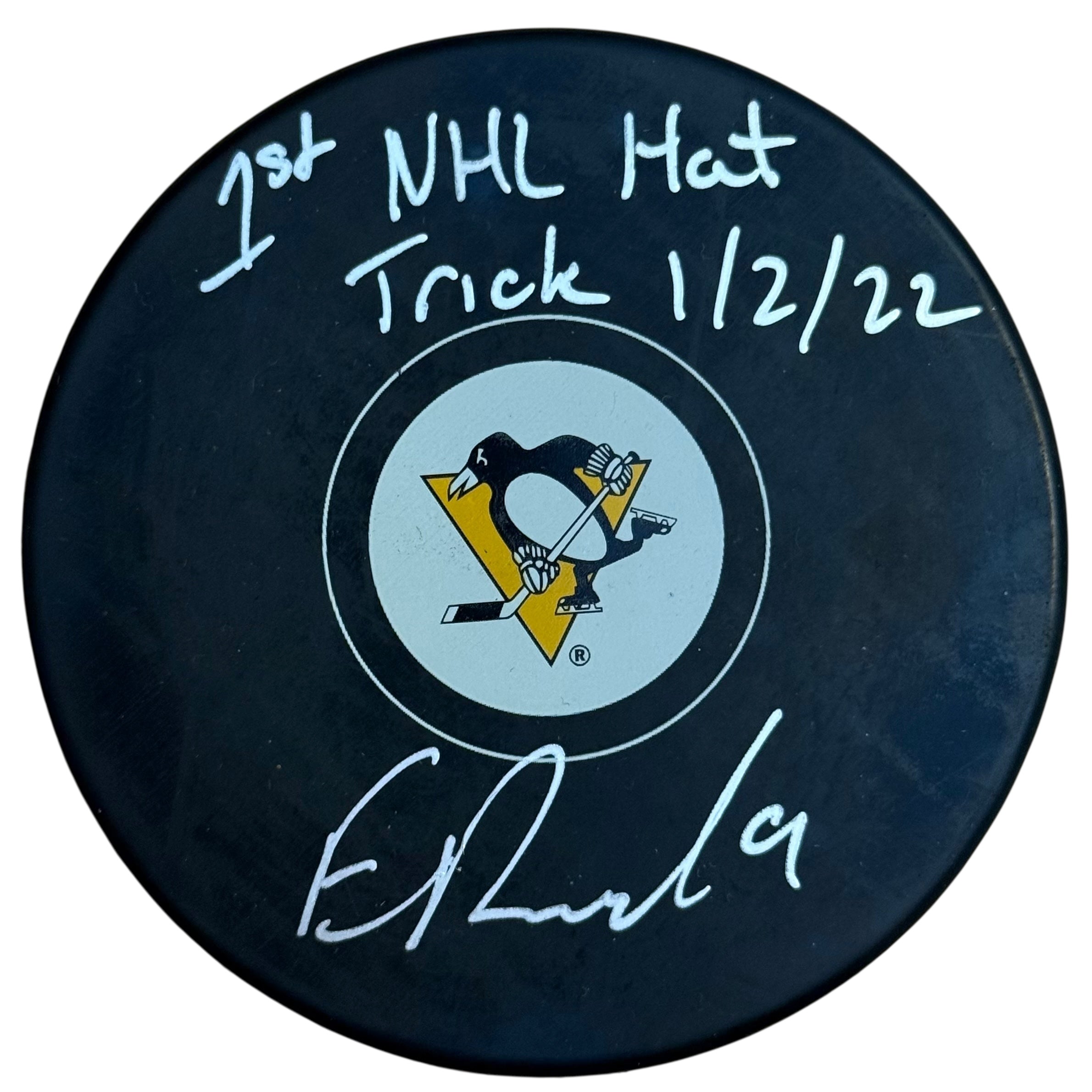 Evan Rodrigues Signed, Inscribed "1st NHL Hat Trick 1/2/22" Pittsburgh Penguins Hockey Puck, which Evan personally hand-signed.